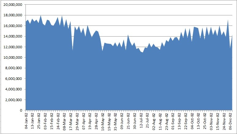 After three years of rising ratings, Coronation Street fell to an average of 14.5 million viewers, shedding nearly 1.4 million of 1981's audience in the largest single-year-drop up to that point. Every month saw a fall from the same month the year before - the first time this had occurred - with drops ranging from 0.1m in April to 2.3m in June. The highest-rated episode was Episode 2167 on 6th January, with 18.95 million viewers, the lowest peak since 1974. This was the lowest-rated year of the 1980s, and the lowest up to that point excepting 1960 and 1961 when Coronation Street wasn't fully networked.