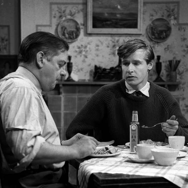 Frank Pemberton and William Roache in the dry run of Episode 1 (note the patterned wallpaper and props on the back set of 3 Coronation Street compared to the transmitted version of the episode).
