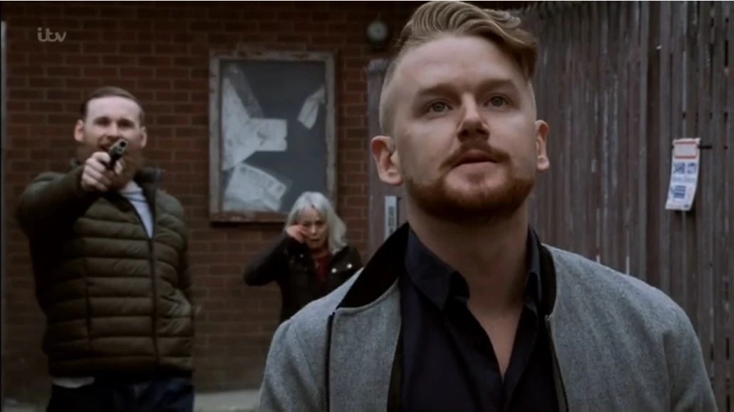 Part One: Jenny tries to reassure Johnny of her sincere regrets. She brings him up to date on the situation with Sharon, emphasising that Rita is currently in danger. Having returned to the Kabin, Sharon forcibly takes Rita’s phone off her when Jenny calls. A panicking Carla finds out from West Place Home and Lifestyle that Lucas left the firm three weeks ago and they have no record of any order from Underworld. She’s too preoccupied to listen to Adam when he tries to explain why he’s pulling out of the liver donation. Having come clean to Rita about Leanne and her part in the kidnap, Sharon pours her heart out to her, explaining that after her relationship with Ian fell apart, she had no choice but to join her drug-dealing brother and his wayward son, and her life cycled downhill from there. Rita assures Sharon that she still loves her no matter what, but her former foster daughter feels it’s too late now to get herself out of the mess she’s in. The funeral cortege arrives. Corey watches on, insistent that he’s just there to pay his respects. Roy tells him to go away. Maria asks Imran for divorce advice and is surprised to hear that Gary wasn’t involved in Sam’s kidnapping. Having shown Daniel his new telescope, Sam and David can’t raise a response from the Kabin. Passing in the street, Sam mentions to Gary that he saw Sharon with a suitcase. Gary then spots Robbie's white van parked on Viaduct Street. He alerts Imran who calls the police. Finding out that Sharon is inside the shop with Rita, Gary kicks the door down but Sharon escapes through the back. Gary snatches the van keys and Robbie gives chase, cornering him in the Brewery Lane ginnel behind No.8 with an aimed pistol.