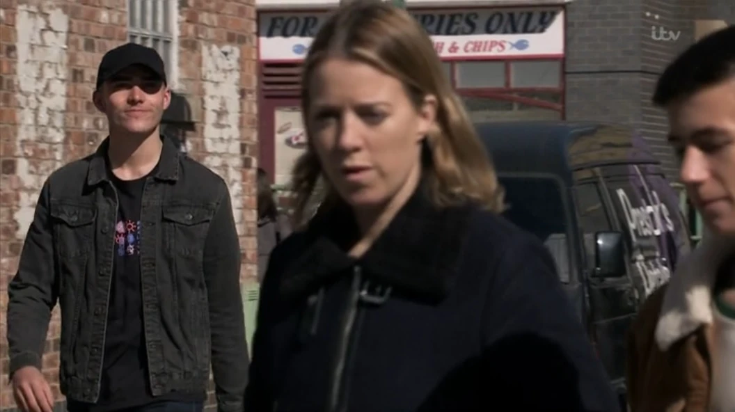 Part One: A troubled Jack watches on as Kevin and Abi discuss Tez's visit. The boy complains he has an earache and Kevin agrees he can stay off school as it's the wedding tomorrow. Maria is incensed to hear about a new bypass which will go through the Red Rec, destroying Liam's football playing field, and thinks something ought to be done to stop it. Curtis complains to a sympathetic Emma that he has an anatomy exam tomorrow and his medication is making it hard to concentrate. Yasmeen is happy that Speed Daal's turnover seems to be improving. Zeedan isn't pleased to see that Ryan has been rehired as a waiter. He lies to him that Hashim was there just to tie up loose ends. Corey taunts Abi and an upset Jack as they walk to the cafe. Ryan tells Alya about the argument he witnessed between Zeedan and Hashim. Hearing Abi and Jack talking about Corey's abuse, Nina tells Abi about the finding of Corey's clothes. Stu uses the soup kitchen in Victoria Street. Corey approaches him and demands a word. Hearing about Tez from Kevin, Debbie offers to call in on Abi and make sure all is fine about her ex. Zeedan is transferring money from his holdall to the till when Craig comes in to see him, Alya having reported his possible trouble with Hashim.