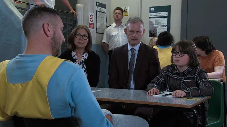 Part One: Fiz asks Tyrone to remove the John Stape books from the outhouse. Alya starts at the solicitors. Nick wonders if he's right to let Sam see Harvey when Simon tells him it's more important to protect Sam than to please him. Mary doesn't think she has enough experience with men to play a convincing temptress. Ken suggests she find inspiration from actresses of the Golden Age of Hollywood, such as Rita Hayworth. Nick and facilitator Karis Jansen take Sam to Highfield Prison. Tyrone finds the outhouse has already been emptied. He assumes Fiz took the books to the tip, unaware that Hope has taken them to school. In the prison visiting room, Sam meets his mother's killer.