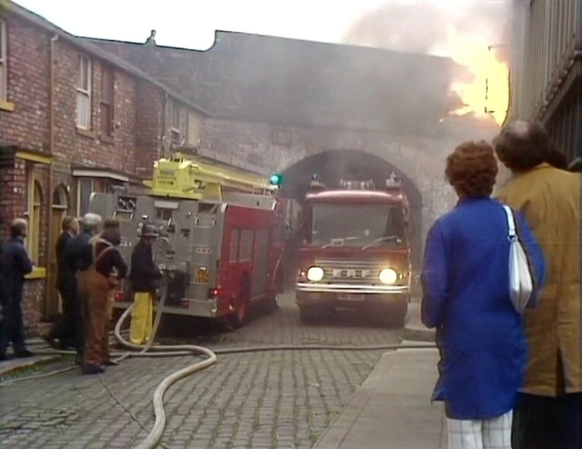 - All of the sequences on the Grape Street set were OB recorded. Unusually, one shot of the second fire engine arriving at Coronation Street showed the railway goods yard which then stood the other side of the viaduct. This now forms a part of the Museum of Science and Industry in Manchester.