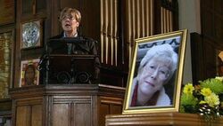 Part Two: Inside the church, Janice is amused that Blanche's chosen music is Ac-Cent-Tchu-Ate the Positive. Tracy's put out when Amy sits with Steve and Becky in church and doesn't smile at her. Sian informs a thrilled Sophie that she will not be returning to Southport until her exams. With the One O'Clock Club gazing down from the gallery, a nervous Deirdre takes to the pulpit, delivering an affectionate eulogy which recalls both Blanche's good and bad points. Hilary arrives at No.6 and it's clear the hard-faced woman's going to be tough to impress. After the service, Audrey warns Tracy off from approaching Gail in prison. As the coffin is taken for its burial, Tracy and Amy are reunited and Amy tells her mother about her impending name change. Tracy confronts Steve and Becky, and a fight breaks out in front of a crying Deirdre.