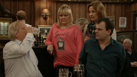 Furious at Gail's ultimatum, Audrey suggests to Lewis that they go on a cruise. Rita, Norris, Dennis and Mary make plans for Rita's wedding over dinner in the bistro while Eva waits on them attentively. Nick and Kylie are supportive of Audrey whilst David remains staunchly behind his mum. Dev sends Aadi and Asha to bed and tries to talk to Sunita about her drunken arrest. Sunita remains frosty and uncommunicative. Maria drinks with Marcus and Sean sulks as Marcus had said he wanted an early night so wouldn't go out with him. Dev is taken aback when Sunita makes it clear just how unhappy she is with their marriage. Julie, Eileen, Beth, Izzy and Gary enjoy their drink together after work. Paul enters the Rovers with Lesley. He apologises profusely, but needs Eileen to take over looking after Lesley as he's had an emergency call from work. Lesley stays drinking with the group in the pub. Paul is grateful. Maria tells Marcus that Liam needs a bunny outfit for an Easter fair and Marcus persuades Sean to make one for him. Ken, a little drunk, moans to Steve about Deirdre and Tracy. Beth tells Ken how aggressive Tracy was when Craig accidentally broke her perfume bottle. David and Nick warn Gail that giving Audrey an ultimatum to give Lewis up will not work. Mary gets angry with Norris at his lack of attention to her wedding folder and her obsessive approach unsettles Dennis and Rita. Audrey enters and announces that she wants David to sign the salon back over to her. Lesley enjoys being in the Rovers and makes choices on the jukebox. Gary and Izzy leave. Eileen confides in Julie that she resents how little time she and Paul actually have together. Deirdre notices Tracy has purchased expensive perfume. Tracy explains it's a replacement for the one Craig broke. Ken returns home in search of whisky and, on seeing the perfume, turns on Tracy harshly about her conniving ways. Deirdre and Tracy are shocked by the brutality of his words. Dev tries desperately to talk to Sunita but he's stunned when she tells him that she can hardly bear to look at him and leaves without saying where she is going. Gail and David beg Audrey to see Lewis for what he is, a cad and a bounder. Audrey loses her temper and David refuses to sign the salon over to her. Ken announces to Deirdre and Tracy that he's had enough and he's leaving. Gail and David decide to join Nick, Audrey and Lewis at the bistro to continue the argument. Steve is shocked when Ken turns up on his doorstep, announcing that he's taking him up on his offer of somewhere to stay. Lewis and Audrey sit with Nick; Audrey is very upset. Eva offers her sympathy. Gail and David continue to beg Audrey to see the error of her ways. Audrey tells them coldly her solicitor will send the paperwork for signature; David retorts he won't be signing anything. Audrey says she will disinherit Gail and David and leaves. Nick is deeply worried for Audrey; Gail and David remain defiant.