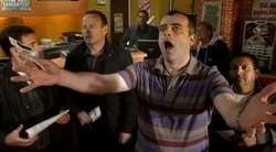 Roy starts his morning relaxation routine. Eileen tells Paul to man up and apologise to Lloyd but he feels it would be as good as admitting he's a racist. Emily goes to see her solicitor to sign No.3 over to Norris. Peter continues offering dangerous odds. Steve takes advantage. When Paul gets a cool reception from Dev and Sophie in the shop, he discovers Lloyd has been telling people he's a racist. Steve is amazed when his horse comes in and he wins £2,000. Peter laughs off the win but is embarrassed when he has to pay the original stake with his own money as the till is empty. Hayley collects her test results from the medical centre. Steve invites Eileen and Lloyd for celebratory drinks at the Rovers. Paul accuses Lloyd of badmouthing him but Lloyd refuses to accept his "it's just a phrase" excuse and compares him to the National Front. Deirdre helps Tracy with her cold-calling. Hayley is surprised when Deirdre refers her to Dr. Akhtar, Dr Carter having left the area. Rob takes possession of a sports car. Michelle tells Carla that Peter is risking everything.