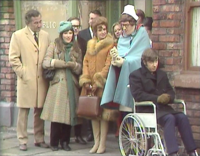- The Grape Street set for the frontage of the Coronation Street exterior makes both its colour debut in the main programme in this episode and its first appearance in brick after having been rebuilt in November and December 1969 (pictured above), however its first true appearance had been some two weeks before when it featured in the Coronation Street contribution to the ITV Christmas Day spectacular All Star Comedy Carnival. The previous wooden set had last appeared in Episode 924 (3rd November 1969).